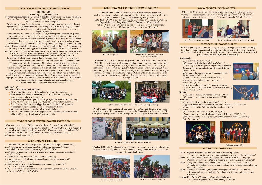 - Każda okrągła rocznica prowokuje do wspomnień, refleksji, ocen i podsumowań. 15 lat... niby niewiele, a ile przez ten czas udało się zrobić, ile ważnych rzeczy się wydarzyło! Nie jest łatwo w kilku zdaniach opowiedzieć historię powstawania organizacji, tworzenia czegoś zupełnie nowego, nieznanego na lokalnym gruncie. Jeszcze trudniej oddać atmosferę tych tygodni, miesięcy, lat, zmagań z problemami, ale i satysfakcji, gdy się coś udawało... Zamojskie Centrum to Stowarzyszenie niezwykłe, tak jak niezwykła jest idea wolontariatu i jej przesłanie”.